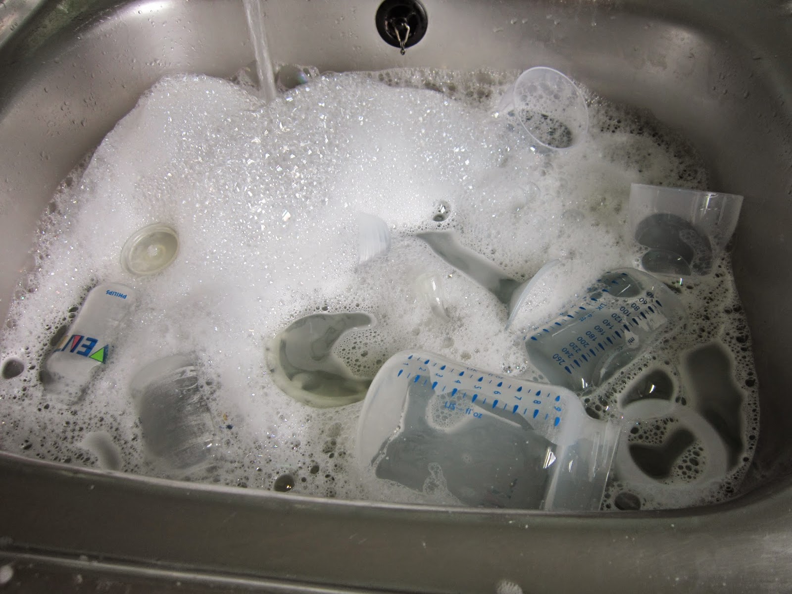 So this is how I'm doing it. I soaked all the bottles and parts and all the breast pump parts and milk storage containers in water and washing up liquid.